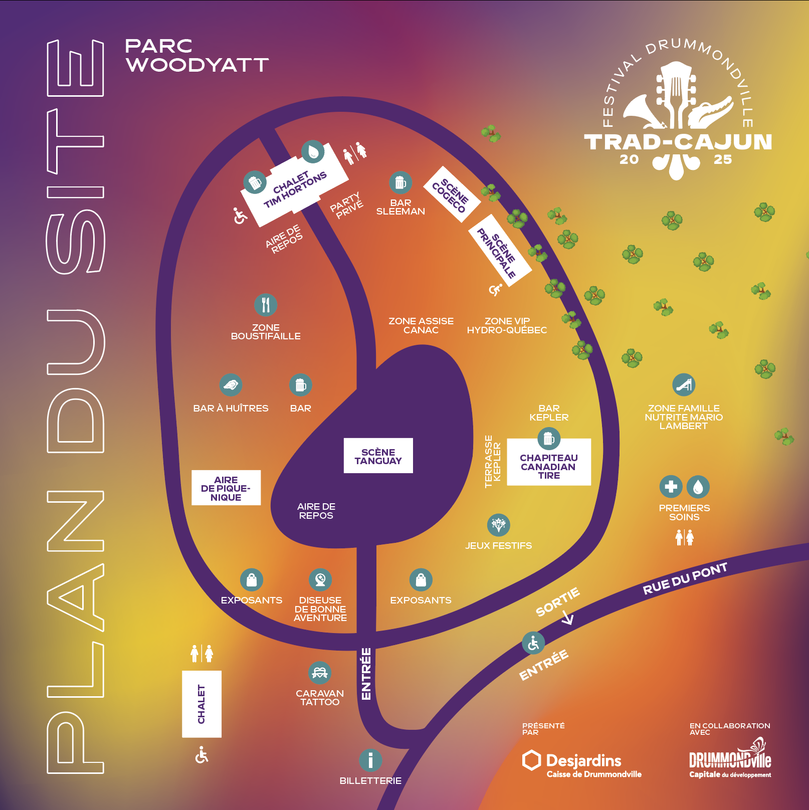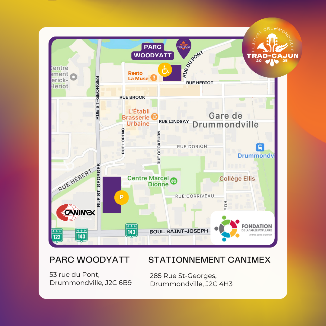 Comme le festival a lieu au Parc Woodyatt (53 rue du Pont), en plein coeur du centre-ville de Drummondville, il y a plusieurs espaces disponibles autour du parc pour se stationner gratuitement.